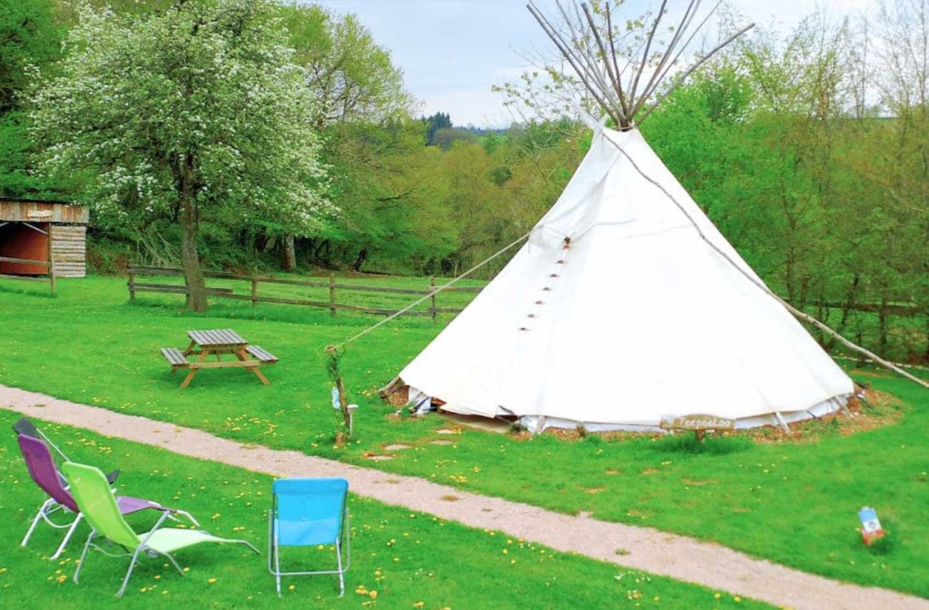 Hébergement en tipi (douches et toilettes privées dans bloc sanitaire commun) ou en cabane trappeur (salle de bain privée) et repas en table d'hôtes sur place (piscine gratuite et sauna : 15 € par personne à régler sur place).