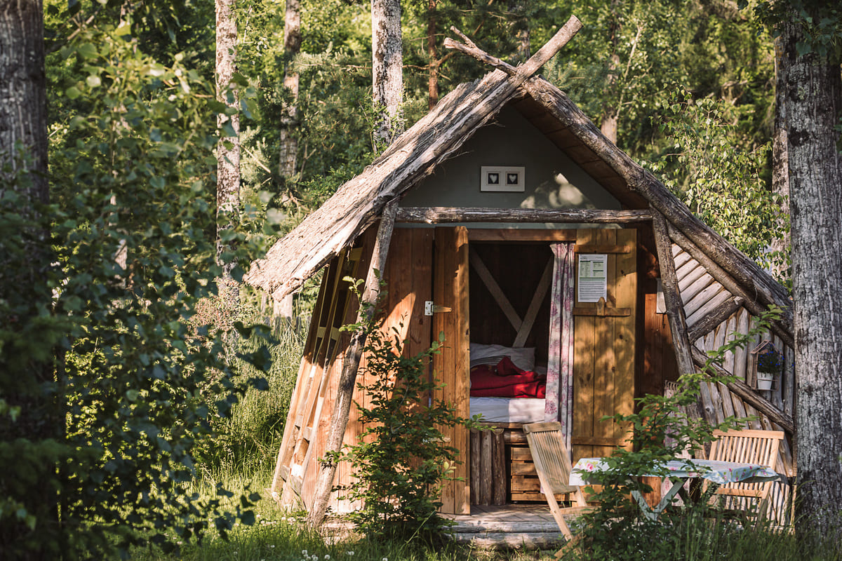 Installation dans votre hébergement insolite : cabane, tente trappeur ou van vintage niché en forêt.